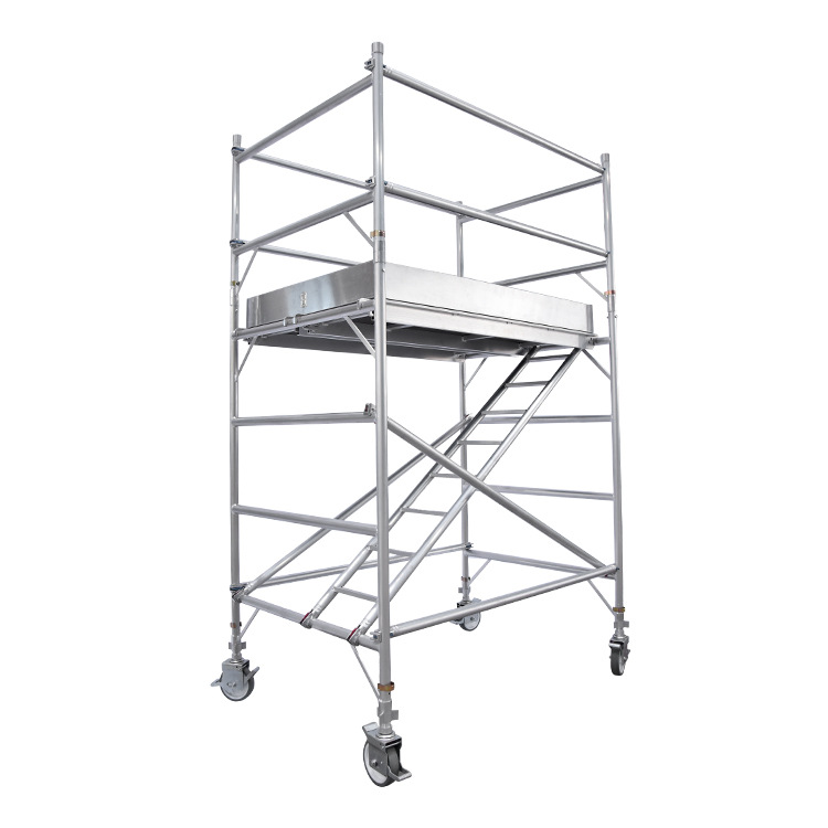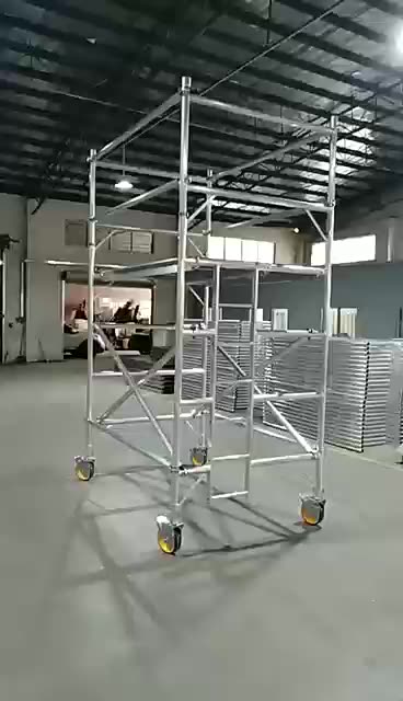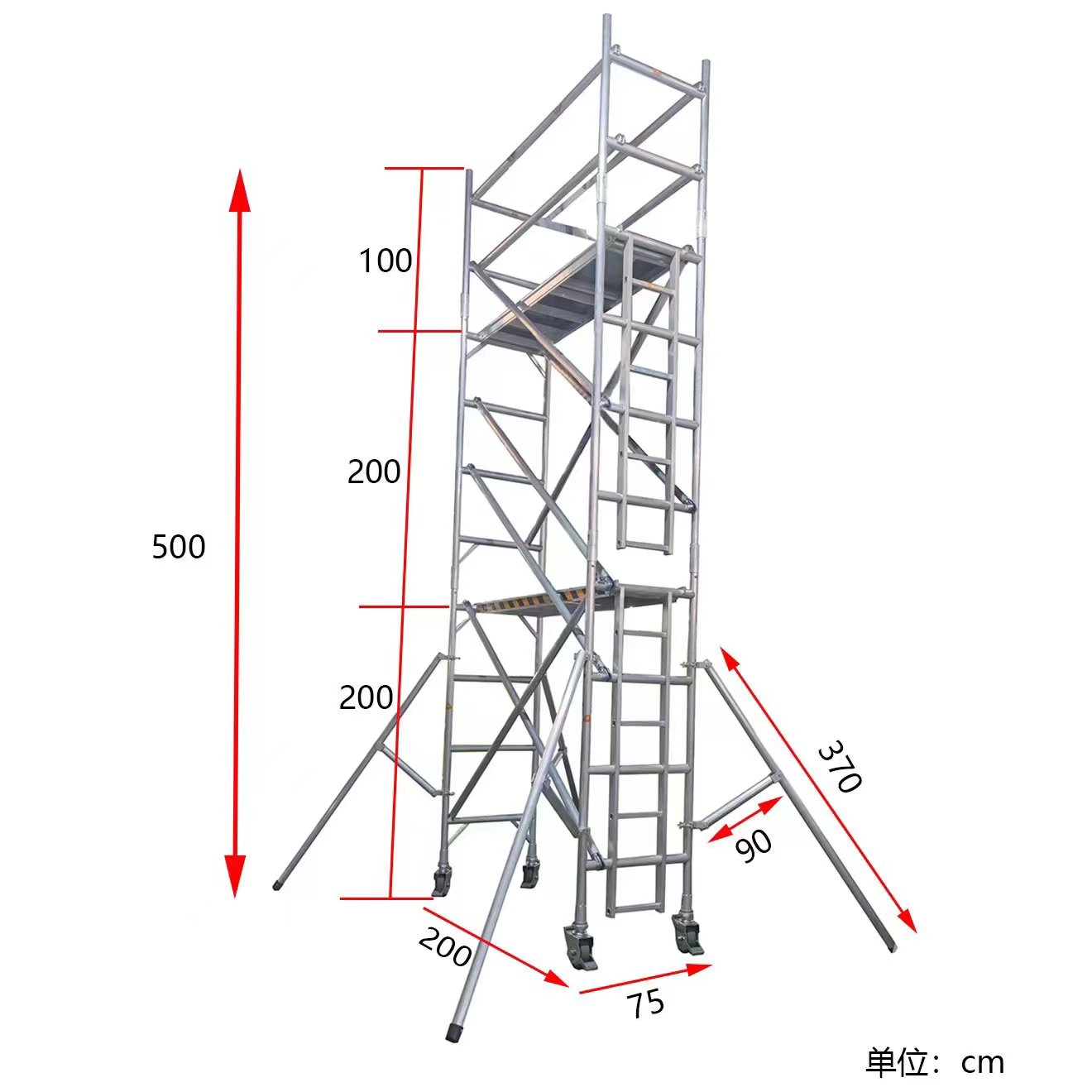 鋁合金腳手架,主要型材為6061-T6和6082-T6,等,常規尺寸為2m*1.35m寬*2m高,一層高度為2m,可以根據不同高度而疊層組織使用,寬度,高度等可訂制,配件:防滑舞臺踏板,腳輪,斜撐腳,攀爬梯等為選配