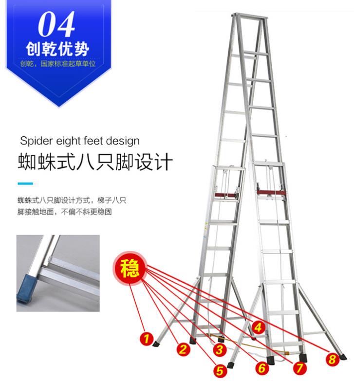 科技是第一生產力,毫無疑問,一款新穎的升降梯就是這樣誕生的,這款高空升降梯子屬于重型工程梯,長度4米到12米,雙面伸縮梯有八只腳,其中有四只是活動腳(在空間窄的地方也能使用),當腳撐開時,能夠獨立使用,無需依靠物,繩子手拉式伸縮方便快捷。